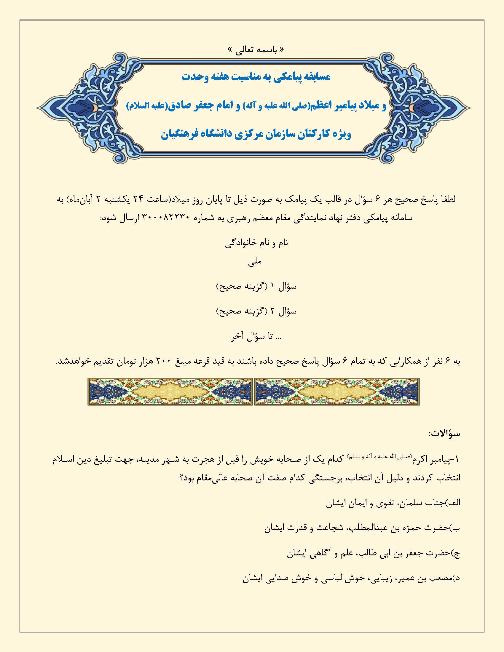 دفتر نهاد نمایندگی مقام معظم رهبری در سازمان مرکزی دانشگاه قصد دارد مسابقه پیامکی به مناسبت هفته وحدت و میلاد پیامبر اعظم(صلی الله علیه و آله) و امام جعفر صادق(علیه السلام) ویژه کارکنان سازمان مرکزی دانشگاه فرهنگیان برگزار نماید.